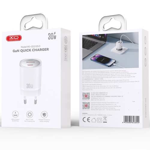 XO CE21 ir uzlabots 30 W sienas lādētājs, kas aprīkots ar vienu USB-C PD portu un vienu USB portu. Tas nodrošina pietiekamu jaudu pat lielāko pieejamo mobilo ierīču ātrai uzlādei. Klasiskais dizains iederas visu veidu interjerā, un izgatavošanas kvalitāte norāda, ka tā ir stabila un izturīga ierīce.