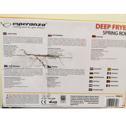 Esperanza fritieris SPRING ROLL noteikti patiks visiem kartupeļu uzkodu un citas ceptas gaļas cienītājiem. Ierīce ļaus dažās minūtēs apcept kartupeļus, lai būtu kraukšķīgi no ārpuses un mīksti iekšpusē. Tas var arī apcept citus produktus, piemēram, gaļu, sēnes un dārzeņus. Pateicoties lielajai jaudai, cepšana ir ātra un ļoti vienkārša. Pateicoties spējai regulēt temperatūru, tāpēc jums ir pilnīga kontrole pār ceptu ēdienu līmeni. Izbaudiet mājās gatavotus kartupeļus!