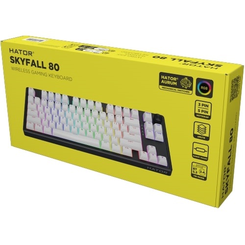 HATOR Skyfall Wireless ir jūsu augstākās klases uzlabojums spēlēm un darbam — stilīgs, daudzpusīgs un radīts komfortam. Šī augstākās klases tastatūru sērija apvieno modernu dizainu, progresīvas tehnoloģijas un vairākus formas faktorus. Trīs savienojuma režīmi: 2,4 GHz bezvadu, Bluetooth un USB-C