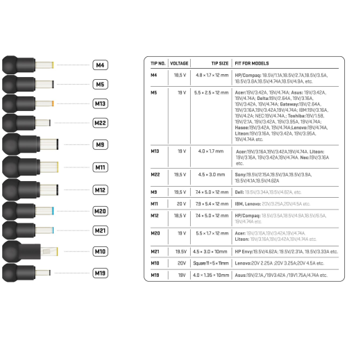 Universal notebook adapter suitable for most commercially available models thanks to the set of 11 detachable connectors.