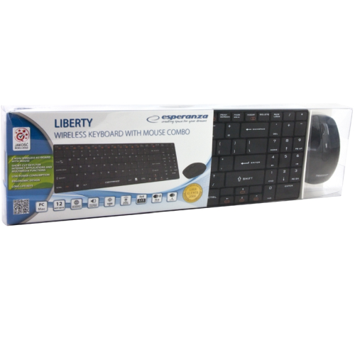 Esperanza LIBERTY — это беспроводной комплект, состоящий из мультимедийной клавиатуры нового поколения и мыши. Элегантный дизайн, низкопрофильные клавиши клавиатуры и гладкая глянцевая поверхность мыши делают его стильным дополнением к любому рабочему месту. Клавиатура оснащена дополнительными мультимедийными функциональными клавишами для быстрого доступа к «Моему компьютеру», браузеру, электронной почте, калькулятору и любимым веб-сайтам. Она также позволяет удобно управлять воспроизведением мультимедиа с помощью клавиш «предыдущий трек», «следующий трек», «воспроизведение/пауза» и «отключение звука», а также регулировки громкости. Буквы и символы нанесены методом УФ-печати со специальным защитным покрытием, обеспечивающим высокую износостойкость. Комплект изготовлен из высококачественных антистатических материалов и защищен от электромагнитных помех. Совместим как с ноутбуками, так и с настольными компьютерами.