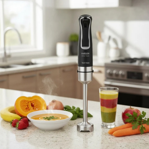 HAEGER Ultra Twist 1500 rokas blenderis apvieno ārkārtēju jaudu, precizitāti un ergonomisku dizainu, pārveidojot jebkuru recepti par praktisku un gardu pieredzi. Aprīkots ar 1500 W līdzstrāvas motoru, tas nodrošina pietiekamu jaudu, lai sasmalcinātu ledu, riekstus un cietākas sastāvdaļas, vienlaikus saglabājot krēmīgu zupu un delikātu mērču gludumu.