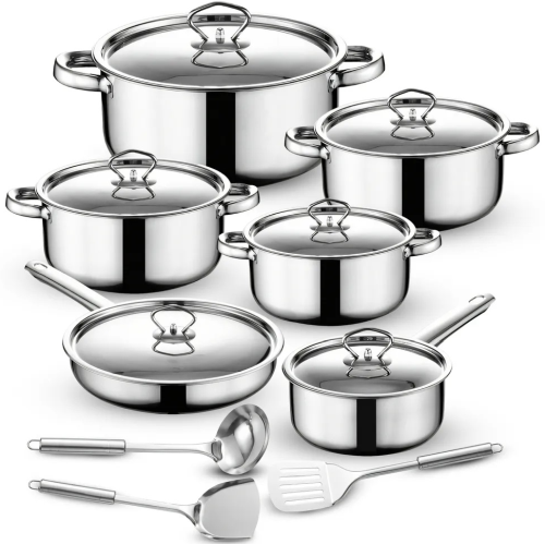 Šis praktiskais 15 daļu virtuves piederumu komplekts atvieglo ikdienas ēdiena gatavošanu un cepšanu dažādās situācijās. Pateicoties dažādiem katlu izmēriem un iekļautajiem virtuves piederumiem, jūs varat ērti pagatavot zupas, mērces un ceptus ēdienus, neiegādājoties atsevišķus piederumus. Komplekts ir saderīgs ar gāzes, elektriskajām un indukcijas plītīm, padarot to daudzpusīgu jebkurā virtuvē. Nerūsējošais tērauds, izturīga konstrukcija un drošība mazgāt trauku mazgājamajā mašīnā nodrošina ērtu lietošanu un ērtu tīrīšanu.