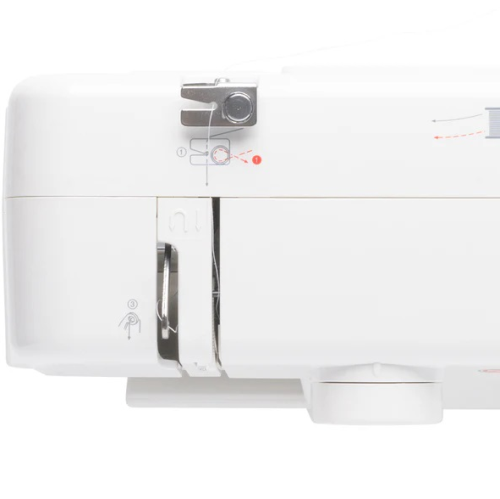 Spolīte augšpusē, lai viegli ievietotu un uzraudzītu spolītes diega padevi.