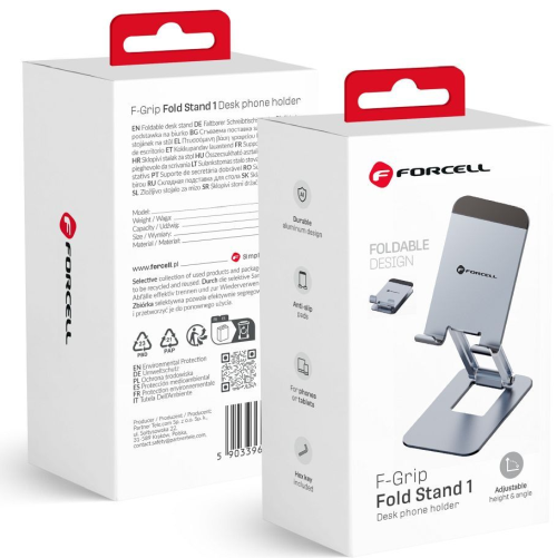 Forcell F-Grip Fold Stand 1 — это складная и сверхлёгкая настольная подставка для смартфонов и небольших планшетов, изготовленная из прочного алюминия. Компактный дизайн, регулируемый угол наклона и прочная конструкция делают её практичным и универсальным аксессуаром для использования в офисе, дома или в дороге.
