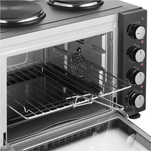 Электрическая духовка Sencor SEO 3500BK с конфорками легко справляется с приготовлением супов, соусов, запеканием пасты и даже запеканием целой курицы благодаря общей потребляемой мощности 3200 Вт и объему 35 л. Удобство управления обеспечивается 4 поворотными регуляторами. Текущая работа конфорок и духовки отображается 3 отдельными индикаторами.